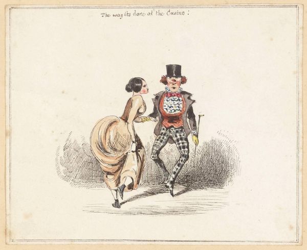 Curator: Let's turn our attention to "Fashionables of 1818" by George Cruikshank. It's a colored etching and print made with colored pencil and etching. This piece currently resides here at the Art Institute of Chicago. Editor: My first impression is... satirical. There’s such a wonderful exaggeration of bodily form. It evokes a playful mood, but perhaps a cutting commentary on societal norms of the time, too. Curator: Precisely. Cruikshank was a master of caricature. This piece embodies a critique of the aristocracy through the lens of Romanticism, right on the cusp of Neoclassical ideals. Look at how the clothing and body shapes become symbolic, laden with meaning about class and gender. Editor: Absolutely! The impossibly high-waisted gowns, the padded shoulders, the constricted figures...they all speak volumes. Notice how the artist emphasizes verticality, elongating the figures in an almost grotesque way. This exaggeration echoes the stylistic lineage of elongated forms found in Mannerist painting, or the much later visual style of El Greco. Do you see it? Curator: Indeed, the historical and cultural implications here are fascinating. Consider the role of fashion in shaping identities. What does it mean for women to present themselves in such controlled, restrictive ways? What freedoms or oppressions does this artwork reveal within English society in 1818? It definitely serves to represent a shift in social constructs around this time. Editor: I also find the accessories very compelling. The feathered headpieces and enormous muffs feel almost like trophies – visible declarations of wealth and status. In our era of celebrity obsession, we find an interesting comparison to that historical need to impress through ornamentation. Curator: Exactly! This speaks to the enduring power of symbols within the image. What began as commentary now serves as an archetypal marker of elite circles across generations. What do you think our contemporary audience will make of this particular piece? Editor: It's always revealing to examine such loaded iconography and see how cultural memory shifts over time. While some signifiers may be lost or altered, that human tendency toward adornment persists, but in novel forms. Curator: Agreed. I'm also curious to witness how current intersectional perspectives—related to class, gender and body image—affect the audiences and inform contemporary interpretations.