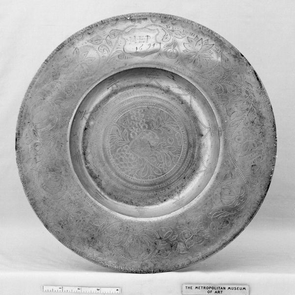 Editor: Here we have Reinhold Vasters' "Salver," crafted from silver and metal somewhere between 1585 and 1899. It looks remarkably intricate, and very baroque in its ornamentation. What really stands out to me is the level of detail. How might you interpret the symbolism within such a decorative object? Curator: The beauty here lies in how it acts as a looking glass into its own time. Think of the baroque era: ornamentation wasn't just decoration; it communicated status, power, and an understanding of a complex symbolic language. Do you notice the recurring motifs? Editor: Yes, lots of floral swirls, almost like stylized vines, contained within geometric sections. Curator: Exactly! And what might that contrast of organic and geometric suggest to you? This division into distinct panels also highlights the role that ornament had within social rituals. Consider how this piece would have functioned during a feast: passing around food wasn’t merely about sustenance; it was about solidifying bonds and hierarchies. Every element, down to the placement of the motifs, played into that. How do you think this salver might reflect on later iterations of this object? Editor: Well, compared to today’s more functional serving trays, it almost feels like it elevates dining to a performance. There's an emphasis on ceremony and displaying wealth. Curator: Precisely! The "Salver" tells a silent narrative of social customs. We can learn so much about its era from the artistic expression contained within the work, it really is a sculptural image of society. Editor: I never thought I'd get so much out of something seemingly so simple at first glance. Thank you for your insight! Curator: My pleasure, these objects offer silent clues to human civilization that simply need our observation.