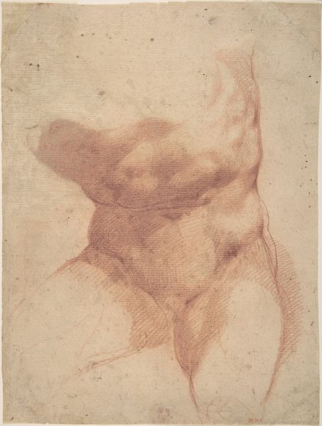 Curator: Here we have a "Male Nude," a charcoal drawing by Giovanni Battista Gaulli, dating sometime between 1639 and 1709. What are your initial thoughts on this work? Editor: Well, there's something incredibly languid and vulnerable about it. The pose, that drowsy look... It's intimate, like catching someone unguarded in their sleep. Also, the subtle use of color! Gives me that fading light, golden hour vibe... Curator: The Baroque period, during which Gaulli was active, was intensely interested in representing the human body, and of course often emphasizing drama. In considering our contemporary context, what possibilities might be available if we looked at such a figure through the lens of power, objectification, or even fragility? Editor: Ooh, I get what you mean. We could explore it as a study in vulnerability, how societal expectations of masculinity collide with this tender portrayal. You know, flipping the script on the male gaze, perhaps? I like it! Curator: Exactly. And thinking about academic art of the time, works like this were often exercises, but even those artistic decisions and the conventions themselves are so linked with broader power dynamics and philosophical understandings of the body at the time. Editor: That’s very true! Also the softness and fluidity that Gaulli creates, with those almost watercolor-like charcoal washes—it creates this dreamy effect... Makes you wonder about the model’s thoughts at that very moment. Was he bored? Tired? Thinking about lunch? I'm being silly, of course, but still! Curator: Not silly at all. It humanizes him. Editor: Precisely. In a world of superhero physiques and unattainable ideals, this feels refreshing, like a whispered secret. Curator: Absolutely. Placing this artwork in dialogue with those expectations creates possibilities. We see not just skill, but a conversation with societal norms around male presentation throughout history. Editor: You’ve given me so much to think about—this wasn't just a sketch; it was like peering through a looking glass. I will be reflecting on art history and our current context a lot longer today, for sure. Curator: Likewise. It shows the incredible potential when art engages with cultural discourses, so even centuries-old pieces maintain their powerful presence.