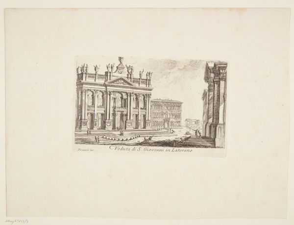 Curator: Looking at Charles Meryon’s 1865 etching, "The Admiralty, Paris", one is struck by its complex detail and historical presence. It's currently held in the collection of the Art Institute of Chicago. Editor: It's quite dark, isn’t it? Almost gothic. The building looms, and there's so much happening in the sky, offsetting the human activity below. It feels charged with social tension, perhaps? Curator: Meryon was indeed preoccupied with representing the changing face of Paris during Haussmann's renovations. His prints often reflected anxieties about modernization and the destruction of the city's historical fabric, a deep romantic undercurrent indeed. The etching captures the grandeur of the Admiralty juxtaposed with a sense of encroaching modernity. Editor: The choice of etching is perfect, isn’t it? Such meticulous labor, forcing an intensity that aligns perfectly with that creeping feeling. What's with the swirling figures in the sky? It looks like Meryon has etched a ghostly carnival happening in the upper register, an ethereal materialization that mirrors the terrestrial activity in a most disquieting way. Curator: Those figures are a curious aspect, open to interpretation. Some say they reflect the anxieties and unrest brewing in Parisian society at the time. Meryon had a troubled life, including mental illness. Perhaps this reflects his internal world projected onto the cityscape. It would fit with the role artists held then to depict or shape public morality through narrative. Editor: Troubled, yes, yet masterfully articulate with his lines. Notice how he contrasts the permanence of the Admiralty building, rendered with sharp detail, with the frenetic energy of the figures below and above, which are less defined. It’s almost as if he's commenting on the instability of progress, using material, technique, and perspective to reinforce his view of what is worth preserving, of valuing slow labor against change and the alienation he must have perceived. Curator: Exactly, his dedication to truthfully rendering the architectural details showcases his respect for the history embodied in the city's structures and the material means by which culture endures. The building becomes more than just stone; it’s a historical anchor. Editor: Seeing it that way adds a powerful layer to the experience. It's more than just a building; it's a silent observer of societal shifts. Thank you for this insight. Curator: My pleasure. It is in that intricate weaving of technique and perspective that we can start to unpack not just what the artist represents, but why and for whom he represents it.