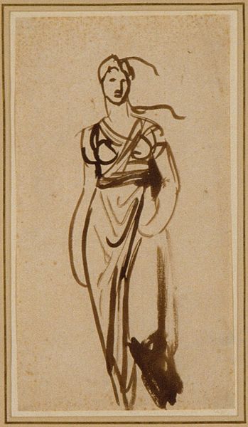 Editor: Here we have Merry Joseph Blondel's "Standing Woman," an undated sketch at the Harvard Art Museums. It feels like a study for a larger work, and I'm struck by the classical drapery. How do you interpret this work? Curator: This image presents an opportunity to consider the construction of femininity and classical ideals within the Neoclassical movement. How might this representation of a woman, seemingly referencing antiquity, uphold or challenge the social roles prescribed to women during Blondel's time? What is she holding? Editor: It looks like she is holding a bundle. It is hard to tell, but I'm assuming that it's a baby. Curator: Exactly! Considering the artist's context, we might see this work engaging with themes of motherhood and domesticity. It reflects the prevailing societal expectations of women as nurturers and caregivers. The sketch almost feels like a political statement, if we allow for the possibility of Blondel's subtle critique. Editor: That’s a fascinating way to look at it. It makes me think about how even seemingly simple sketches can hold complex cultural meanings. Curator: Precisely. Art can be a powerful tool for understanding the nuances of social history.