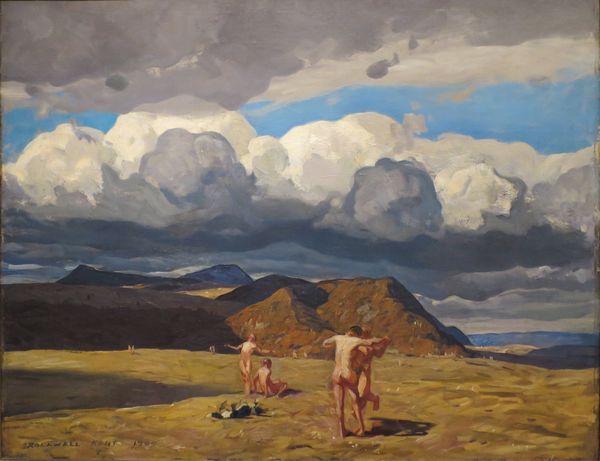 Curator: Here we see "Trip by Cart," an oil painting by Niko Pirosmani, currently held at the Art Museum of Georgia. What are your initial thoughts? Editor: The composition immediately strikes me – this dark, almost brooding foreground contrasting with the stark, snow-capped mountains in the distance creates a very strong sense of depth, almost unsettling. Curator: I agree. This stark juxtaposition creates an emotional weight. Consider the covered wagon, a vehicle often associated with journeys, migrations, and the unknown. The colorful stripes offer some relief, almost a defiant vibrancy. Editor: Yes, those stripes offer a chromatic break! Notice how Pirosmani uses color—the restrained palette accentuates the overall melancholic mood. The painting's rough texture also draws attention to the artist's direct engagement with the materials. Curator: Absolutely. And observe how the looming mountains act as silent witnesses to the human drama unfolding below. The mountains in many cultures often symbolize resilience and endurance, reminding us of the cyclical nature of life and hardship. Perhaps this cart is not simply carrying people, but carrying hopes and burdens. Editor: Structurally, the positioning of the cart and the white horse creates lines of movement within the piece. This draws our eye through the landscape toward the remote, almost ethereal buildings nestled on the hillsides. The darker mass of the dwelling on the right feels like an intentional visual anchor. Curator: Consider those isolated structures and the travelers passing by, caught between nature’s grandeur and humble homes. Perhaps it is suggesting the interconnectedness of humanity and the environment. Every journey, however small, leaves its mark. The wagon is more than an object. It carries history, experience, and community. Editor: This all reinforces a reading of romanticism, perhaps even a touch of the sublime. These dark washes evoke nature’s overwhelming power, whilst those tiny, rendered details of human dwellings assert a visual struggle. Curator: An insightful connection. "Trip by Cart" speaks of the beauty of simplicity and endurance in the face of overwhelming grandeur. Pirosmani beautifully captures both the temporal journey and our shared, archetypal experiences. Editor: And on a purely formal level, Pirosmani masterfully handles composition, surface texture, and color harmony to deliver a viewing experience with lasting emotional resonance.
