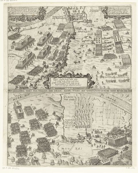 Curator: This engraving from 1642, titled "Slag bij Hickelsmey (bij Kempen), 1642," offers a bird's-eye view of a fierce battle scene. Editor: My goodness, it's so precise. It feels like I'm peering down at some meticulously constructed diorama, a battle rendered with unnerving order. What a strangely compelling tension there is! Curator: Indeed, that sense of order reflects the function of prints like these: they were often commissioned to commemorate specific military events and inform a wider audience about the strategies and outcomes of battles like Hickelsmey. Consider this as a Baroque news report. Editor: A news report etched in lines. I'm captivated by the puffballs of smoke, blooming like grotesque flowers. Is that strange for a war scene to seem… beautiful in parts? Curator: The print captures the theatricality often associated with Baroque art, despite the gritty subject matter. It portrays an attempt to impose a semblance of control on the chaotic realities of war. What’s striking, however, is that there seems to be a simultaneous acknowledgement of its destructive potential, in that same “blooming” you noticed. Editor: Right. A conflict of presentation, almost. The title box is particularly interesting. Curator: Let's discuss this title. We know that engravings of battles, much like photographs today, are never neutral records of history. They are produced by the victors or patrons, often influencing public opinion and solidifying power. Editor: It’s as if every etching mark has its own quiet political leaning. Considering how they manage their image of power, are there notable techniques employed here that we can explore further? Curator: Certainly. Consider the spatial layout—the clear delineation of troops, fortifications, and landscape features serves not only to document the battle but also to project an image of strategic brilliance and control. This idealized depiction promotes an impression of competence, reinforcing their authority. Editor: Ah, and that neat labeling – it reminds me how data is made ‘beautiful’, too – it’s organized beautifully here as the perfect projection. A visual testament to those Baroque battles. What an unexpectedly thought-provoking piece. Curator: Absolutely. It prompts us to critically engage with how historical events are represented, reminding us that images—then as now—are potent tools of power.