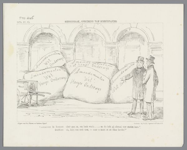 This satirical print by Johan Michaël Schmidt Crans from 1868 depicts the restoration of the Binnenhof entrance with pointed irony. The dominant visual element is the grand archway, a symbol of passage and transition, yet here it is rendered absurd. The arch, a motif stretching back to Roman triumphal arches, traditionally signifies victory and honor. But look closer, here it’s a farcical echo of its former glory, as the arch is evidently too low. We see the gesture of the pointing man as one that mimics the act of showing, and yet, he is pointing to nothing. This absurd gesture is a theatrical display for the viewer. Like the masks of ancient Greek theatre, this symbol has resurfaced, evolved, and taken on new meanings. What was once a noble form is reduced to a critique, the artist engaging us on a deep, subconscious level as the work evokes the human condition: the space between aspiration and reality.