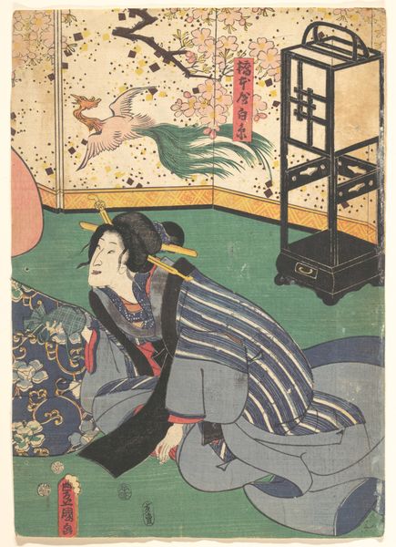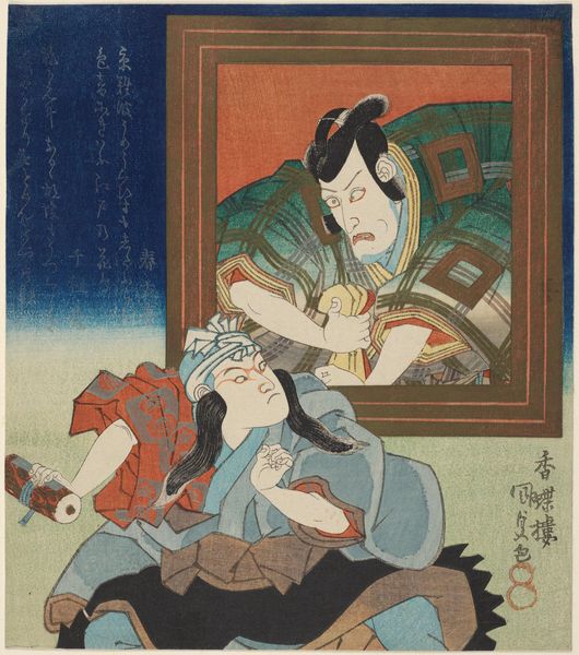 Editor: Here we have Utagawa Kunisada’s 1831 woodblock print, "Young Actor with a Portrait of Ichikawa Danjūrō VII." It's a fascinating image, a sort of "painting within a painting," or rather, a "print within a print." What stands out to me is how the materiality of the printmaking process informs its layered composition, it seems so intricate! What do you see in this work? Curator: As a materialist, I'm immediately drawn to the woodblock printing process itself. Each color, each line, represents a separate block, painstakingly carved and aligned. This isn't just about depicting two figures; it's about the labor and the artistic decisions embedded in its creation. Notice the plaid patterns of the robe and the textures: how do you think they represent consumption within Edo society at this time? Editor: That's fascinating! The plaid certainly seems deliberate. Perhaps a way of demonstrating status through the suggestion of opulent materials? But also, it makes me consider: is the younger actor critiquing the older one’s constructed persona or paying tribute? Curator: Precisely. Consider the role of the publisher. Woodblock prints were not just artistic expressions but commercial products. This image would have been widely circulated and consumed. By including a "portrait within the portrait," the artist comments on commodification and mass reproduction of identity. This allows for a critical engagement on social representation that transcends singular authorship, wouldn’t you say? Editor: I never thought of it that way, that labor and distribution would influence artistic intent, but it certainly gives a new perspective on this print and on Ukiyo-e traditions. Curator: Exactly! By shifting our focus from individual genius to material culture and production methods, we can gain a much deeper understanding of how art functions within society. I think thinking about "production" has changed my initial understanding!
