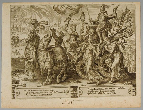 Editor: Here we have Daniel Hopfer's "The Last Judgement." It's a very detailed etching. I am impressed by the depth and density that Hopfer achieved. What strikes you most about how this piece was made? Curator: For me, it's the innovative process. Hopfer was experimenting with etching techniques, likely adapting methods from armor decoration, to create prints. The physical labor and craft involved in etching these intricate lines into metal – the materiality of the plate itself – speaks volumes about the artistic production of the time. Editor: So, you're highlighting how the method shaped the artwork? Curator: Precisely! It challenges the traditional hierarchy between printmaking and other more 'prestigious' art forms. It makes you consider the socioeconomic status of the artisan versus a master artist. The "how" becomes as important as the "what." Editor: I never thought of it that way before. Thanks!
