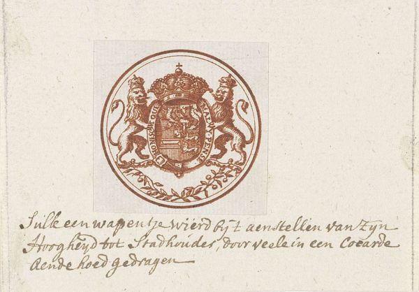 Editor: This is "Vignet met wapen van Nederland" by Anthonie van den Bos, made sometime between 1778 and 1838. It’s a drawing and engraving, mainly in ink on paper. The composition is very formal and seems to focus primarily on communicating the content, what do you make of this piece? Curator: Indeed. Notice the tripartite division, the heraldic achievement above, then the text and its framing lines below, and finally, the stark base. Observe how the engraver’s precise lines delineate the crown, shield, and supporters in the heraldic display. Note also how those rigid components sit within an almost casual oval of tiny pricks and dashes, a juxtaposition, if you will, of geometric form against free form. Editor: That's interesting. The "pricks and dashes" are certainly more informal than the symbols depicted above, which feel decidedly rigid and formal. So what would you say is the significance of this contrast, or the role that such symbolism and balance might have played at the time? Curator: Precisely. Let us consider the symbolism inherent in the arms of state of the Netherlands, rendered in painstaking detail and consider its interplay with the simple typography in service of Royal decree, that of ‘BREVET...KONING der NEDERLANDEN.’ Editor: So it’s a study in contrasts then, of formal iconography versus simple text, perhaps symbolizing different kinds of power at work? Curator: Yes, consider that a valuable point. The piece itself seems an emblem of transitions in style. The composition leads the eye sequentially and also in a very balanced manner, that feels complete, would you agree? Editor: Yes, I can see that now, the weight is distributed evenly, it’s quite balanced between heraldry and text. Thanks for illuminating these relationships. Curator: My pleasure, a pleasure indeed to re-consider what formalism can teach us here, today!