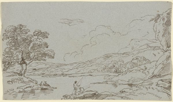 Curator: So, here we have "Two Figures by a River," a pencil drawing created by John Constable around 1807-1809. Editor: It's dreamy, almost a half-formed memory. The lines are so soft, making it feel like a fleeting moment captured on paper. Kind of makes me wish I were there, dipping my toes in the water. Curator: Constable was indeed brilliant at capturing a sense of place, but what fascinates me is the context of Romanticism—this movement saw artists turn to nature and emotion as primary subjects in response to industrialization and the rationalism of the Enlightenment. This drawing seems like a direct expression of that yearning for an untouched world. Editor: Untouched, maybe. But those two figures are key; it is never quite “untouched” is it? Even in a simple sketch, it feels as if there's this quiet story unfolding. Wonder what they are talking about. Maybe it is something deeply profound, maybe they are just sharing fishing stories, you know? It makes the scene both grand and human. Curator: Absolutely. Landscape in Romantic art wasn't just pretty scenery; it became a space for personal reflection, infused with emotional and even political undertones. The figures' inclusion shifts the focus from pure nature to the interaction between people and their environment. He places the social within nature; they both exist on a continuum. Editor: That interaction feels key. I like the sparseness, how Constable trusts the negative space, and the imagination to fill in the blanks. I'm oddly at peace looking at this simple sketch. It reminds me that you don't need overwhelming detail to convey profound meaning. Curator: And for the viewer, this sketch might not scream grandiose ideals or historical narratives but rather gently whisper stories of human experience, landscape and memory all mixed together. Editor: It's a little snapshot of quiet contemplation, a reminder that beauty can be found in the simplest of encounters. Nice bit of visual poetry.