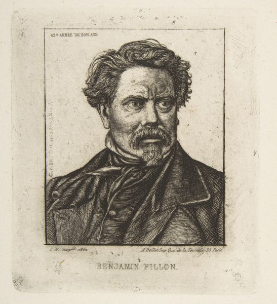 Charles Meryon created this intricate engraving of French archaeologist and numismatist Benjamin Fillon. At first glance, the portrait’s most striking feature is the density of its linework. Meryon uses a complex network of etched lines to define Fillon’s features and clothing, creating a rich texture that is both visually stimulating and deeply descriptive. The intensity of the gaze, amplified by the stark contrast between light and shadow, draws the viewer into a psychological space. Semiotically, the etching lines form a code, translating three-dimensional form into a two-dimensional plane. This intense mark-making transforms the representation of Fillon into a study of form and structure. The interplay of lines and textures challenges fixed notions of portraiture, transforming it into a meditation on the very act of seeing and interpreting. The engraving prompts us to consider how we construct meaning through visual codes and challenges us to look beyond the surface to decode the deeper structures at play.