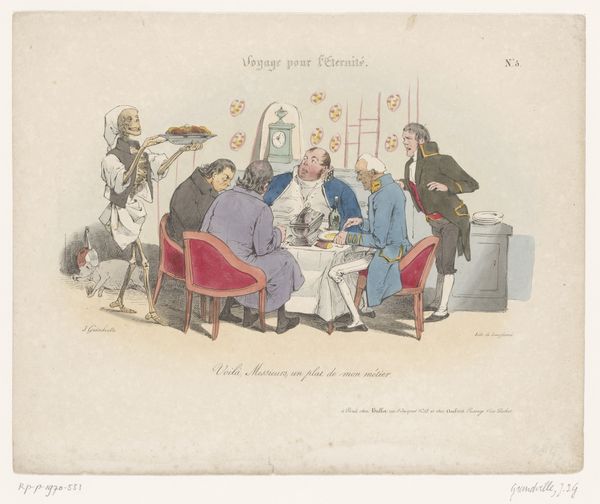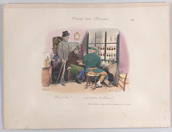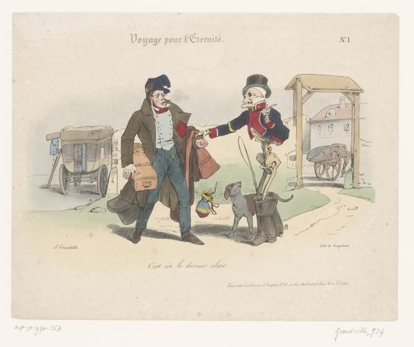 This caricature, "Old man is being fetched by Death as a traveler," was created by Jean Ignace Isidore Gérard Grandville in the 19th century. The composition is arranged around the stark contrast between the figures of Death and the old man, using color and form to emphasize their distinct roles. Death, depicted as a skeletal traveler, is rendered with precise lines, his hollow form draped in earthy tones. The old man is caught mid-action. The artist uses these figures to create a commentary on mortality. Grandville uses the semiotic language of his time to challenge fixed meanings of life and death. The visual elements – Death’s attire, the old man’s posture, and the arrangement of space – function not only aesthetically but also as a part of a larger cultural discourse on the human condition.