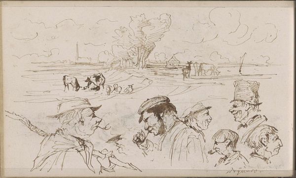 Curator: Here we have a pencil drawing by Jozef Israëls, dating from between 1834 and 1911, titled "Strand met wadende vrouwen en spelende kinderen" – "Beach with Wading Women and Playing Children." Editor: It has this wonderfully wistful feel to it, doesn’t it? All these hazy, light figures just existing on the shore...almost as if they're ghosts of summer memories. Curator: Precisely. Israëls often depicted scenes of everyday life with a sensitivity that resonated deeply with the public. This work is particularly interesting as it is done in pencil, lending a casual feel, providing insights into the process of pictorial composition. Editor: It’s like glimpsing a moment that was never meant to be frozen in time, yet it is, indelibly. The muted greyscale creates an almost cinematic, old-film feel. What's amazing to me is how much movement is suggested by so few lines. Curator: Indeed. The quick, light pencil strokes capture not just the physical forms of the figures but the very atmosphere of the beach. The figures appear engaged in play and simple tasks, seemingly far away from the political issues affecting them. The beach was a site where these rules can be overlooked, and freedom can be enjoyed, even if briefly. Editor: Right? There is such simplicity. Looking at their posture it hints at those small intimate dramas, almost fleeting gestures and hidden meanings behind what one may think is just a genre scene. Curator: And that intimacy speaks to Israëls' social consciousness. While celebrated, this tendency towards sentimentality and domestic scenes attracted criticism from some who believed art should engage with broader social struggles more directly. It raised, once again, the question of what art is 'for.' Editor: Art is for slowing down and seeing the world afresh, isn’t it? In every hurried line I see something universal about humanity itself. Curator: Well, whatever it is, art certainly prompts contemplation. Editor: Yeah, looking at this drawing, I just wanna breathe deep and run into the sea.