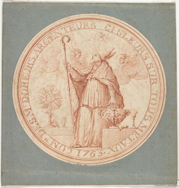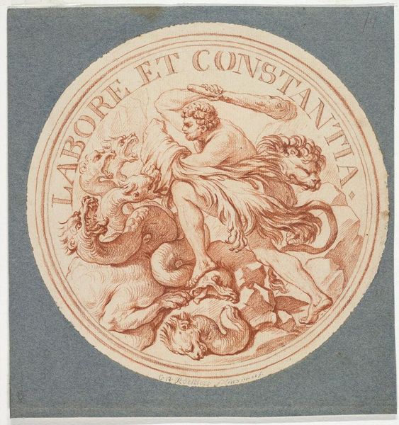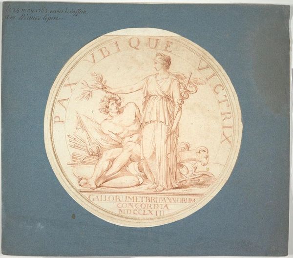 Curator: The Harvard Art Museums hold this striking medal design, attributed to the Studio of Edme Bouchardon, titled "Medal Design for the Mines at Coetanos: LABORE ET CONSTANTIA." Editor: It has an air of nobility, doesn't it? But there's a heaviness, an almost melancholic feel, in the monochromatic rendering. Curator: Indeed. Note the balanced composition. The symmetry in the shields, adorned with fleurs-de-lis and mining symbols, is quite deliberate. The inscription, "LABORE ET CONSTANTIA," meaning "by labor and constancy," is elegantly integrated into the circular design. Editor: It speaks volumes, though, about the priorities of the era. "Labor and constancy" sounds like a directive, perhaps even a veiled expectation imposed on the miners themselves. Who benefited from their labor? Curator: One could interpret it that way. However, formally, the design exemplifies neoclassical principles, a celebration of virtue through idealized forms. Editor: I see a call to duty, but duty to whom? The placement of the symbols above what looks like a cornucopia suggests a flow of wealth originating from the miners' work and supporting the elite. Curator: A valid reading, considering the context of mining in the 18th century. But let us not overlook the sheer mastery of the draughtsmanship. Editor: It's a potent reminder that art isn't created in a vacuum, and interpreting it requires acknowledging the historical and social forces at play. Curator: Precisely. It's the dialectic between form and context that makes it so compelling.