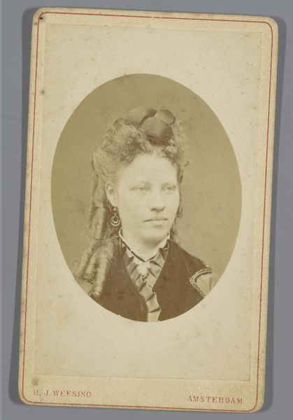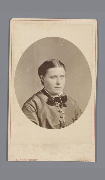 This sepia toned photograph, "Portret van een onbekende vrouw", was created by Binger & Chits. The oval format frames the subject tightly, focusing our attention on her face and upper body. The limited tonal range emphasizes subtle gradations of light and shadow, creating a soft, almost ethereal effect. The composition follows a structured order, with the woman's gaze directed to the left, creating an asymmetrical yet balanced visual dynamic. The material qualities of the photograph itself—the smooth texture and warm hues—contribute to its overall sense of intimacy. The semiotic reading of the portrait reveals the conventions of 19th-century portraiture, where formality and restraint were highly valued. The identity of the woman remains unknown, yet the photograph persists as an enduring testament to her existence, challenging our understanding of representation and memory.