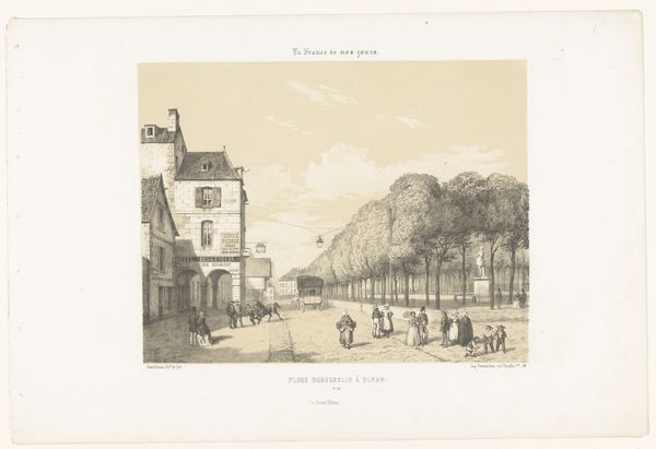 Editor: This is "Zicht op de haven van Boulogne-sur-Mer aan het eind van de Rue de l'\u00c9cru" by Jean-Baptiste Arnout, from 1847, currently at the Rijksmuseum. It's an engraving, and it feels very much like a snapshot of a specific time, doesn't it? It makes me feel like I'm peering through a window into 19th-century France. What do you see in this piece, beyond just a city street? Curator: What I find fascinating is the conscious construction of perspective. It's not just about vanishing points; it's about creating a visual language that dictates how we perceive urban life. Consider the positioning of the figures – carefully placed to draw our eye deeper into the scene. Editor: That's interesting. It almost feels like the people are props in a way, guiding the eye. Curator: Precisely! They’re carriers of cultural narrative. The figures in the foreground, for example, their attire, their postures, are communicating ideas of class, leisure, social interaction, all symbolic within the rapidly changing urban landscape of the 19th century. What do you make of the sky? Editor: It’s quite blank, almost washed out, which I think contrasts with the detail in the buildings. Maybe it’s suggesting a kind of… anonymity? Curator: Anonymity perhaps, but also possibility. The sky, often symbolic of the heavens or destiny, is left relatively unformed, which allows the viewer to project their own narrative onto the scene. It’s as if Arnout is saying, “Here is the stage, now imagine the play.” Editor: So, it’s more than just a pretty picture; it’s about constructing a particular vision of urban life and inviting the viewer to participate in it. I hadn't thought of it that way before. Curator: Exactly. It's about the carefully chosen symbols that build meaning, making the image resonate across time. It’s always fascinating how much these prints carry symbolically, if we take time to decipher them.