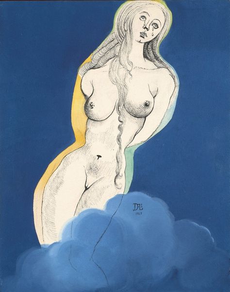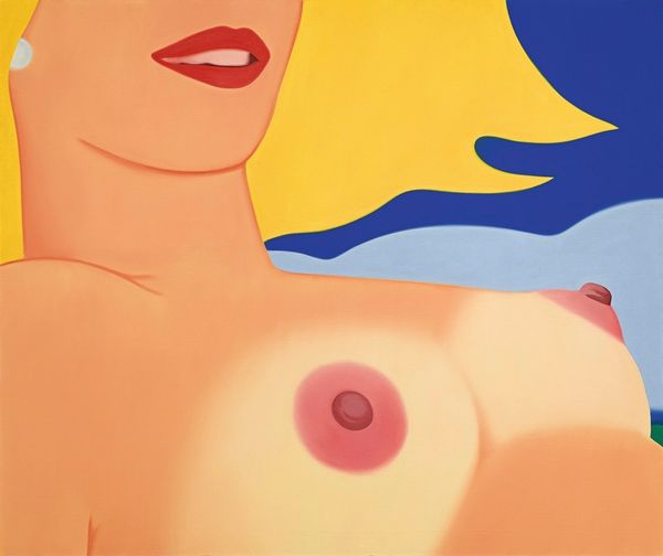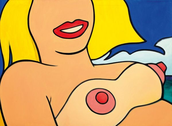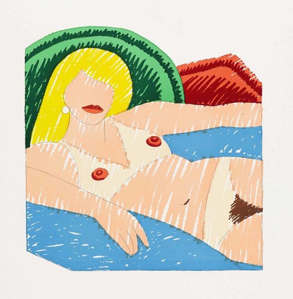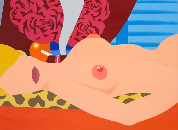 Editor: Here we have Tom Wesselmann's "Study for Nude Aquatint," made in 1980 using acrylic paint. It strikes me how flattened the image is, almost like a collage, with blocks of bright colors forming the figure. What is your interpretation? Curator: It's astute to recognize that flattened effect. Wesselmann is, first and foremost, exploring the formal properties of painting. Observe how the hard edges delineate shapes; the curves of the figure are reduced to essential forms. Note the relationship between positive and negative space and how the flatness emphasizes the picture plane. Editor: So it's less about representing the nude and more about exploring shapes and colours? Curator: Precisely. Consider the relationship between the simplified forms and the bold, artificial palette. The use of acrylic further enhances this sense of flatness, lacking the texture and depth associated with traditional oil painting. Ask yourself, how does Wesselmann subvert expectations about portraiture? Editor: The lack of a face is jarring, yet it pushes me to notice the curves and colours even more. The pink of her skin and the bright blue of the couch become the focus. Curator: Indeed. By eliminating the face, Wesselmann transforms the figure into an object, drawing attention to its formal qualities. Does the work seem to lack emotional depth? Editor: I suppose so. It is emotionally cool, which makes me more attentive to how he deploys the forms. I learned to think less about the subject and more about how shapes are being organized on a plane. Curator: A keen insight! Examining how Wesselmann uses line, colour, and form reveals how an image can evoke and challenge artistic conventions.