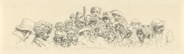 Curator: James Ensor’s drawing, “Christ Before his Judges,” created in 1921. It’s rendered primarily in pencil and ink. What strikes you initially about this piece? Editor: The intensity. The faces, the expressions, all etched with this almost frenzied energy. It looks like a study of a mob, but with each figure individually rendered with a sharp pen. It seems more concerned with documenting than dramatizing. Curator: Right. The figures almost seem piled on top of each other, competing for space, each with his distinct expression. This composition reflects a recurring theme in Ensor's oeuvre: the corrupting influence of societal hierarchies and the individual’s struggle against unjust authority. Think about the historical context. Editor: That layering becomes a central aspect of the means of production as well: the almost compulsive pen strokes, the repetition, a kind of artistic labour mirroring the mob mentality depicted, like he is constructing, literally with physical material, these historical forces. Curator: Precisely, and in his depictions of Christ throughout his career, we see a figure who often becomes symbolic of marginalized identities facing societal condemnation, very much reflecting the turbulence of the interwar period. His masklike figures are never just characters; they are critiques. Editor: Looking at it from a Materialist perspective, the materiality of the drawing also is important—paper, pencil, ink. Cheaply reproduced to spread the idea behind the work. Think also of what it meant to use those industrial materials instead of expensive, refined ones at that time. Curator: The very accessibility underscores Ensor’s radical ethos. Christ, in this instance, represents a call for a moral reckoning, a mirror held up to the viewers themselves. The figures press in with questions of guilt, challenging viewers of the work with their legacy in relation to such injustice. Editor: Ensor's decision to represent such a loaded historical subject in relatively accessible materials and means of making feels so charged with intent. To bring the powerful down by demonstrating that high ideals can and should exist among all people. Curator: Considering both the artwork's message and his method, this pen drawing compels us to question our own participation, past and present, in these narratives. Editor: Right, art-making is embedded within power structures and modes of reproduction—which forces us to reflect on what ethical making should be and how it's made.