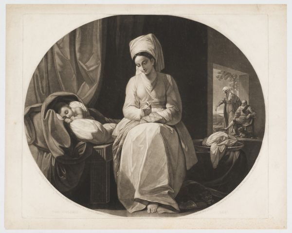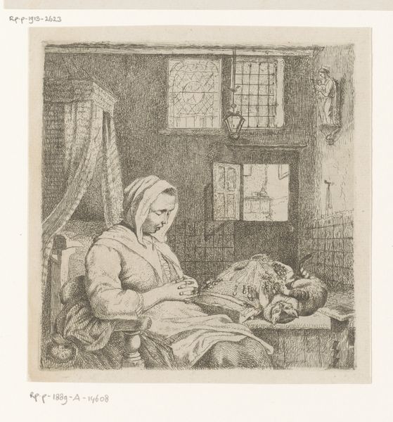 Curator: This is "Zogende moeder," or "Nursing Mother," a print by Anthonie van Volkom, dating roughly from 1847 to 1865, currently residing here at the Rijksmuseum. It’s a beautifully rendered genre scene, very much in the Romantic style. Editor: There’s an immediate sense of quiet weariness emanating from her. The almost monochrome palette, the dimly lit interior… It evokes a feeling of gentle constraint. Curator: Let’s consider the printmaking process. Van Volkom, as the designer, would have collaborated with the engraver E. Maaskamp and printer J. Lutz. The layering of ink, the pressure applied to the paper—it’s all integral to conveying that very feeling. Notice how the cross-hatching builds depth but also traps the light. Editor: Yes, that subdued lighting. It definitely places the focus squarely on the woman, who is framed, rather literally, by the dark backdrop and what appears to be an open window to the left of the frame. You almost can’t help but see her as a symbol of quiet domesticity, especially contrasted against an emerging industrialised society, of the era. What commentary is the artist trying to make through this image? Curator: Perhaps not commentary so much as affirmation. Romanticism, at its core, sought a return to simpler virtues. This idealized version of motherhood, set against the backdrop of burgeoning capitalism and industrial labor, elevates domestic life as a moral counterpoint. Her dress, the fabrics, all indicate modest comfort, achieved through what sort of textile labour, or agricultural production of goods available, should make us consider what that privilege means here. Editor: Yet, there’s a sense of labour present within this quiet intimacy. The texture suggests that they’re not members of a completely detached upper class. Her direct gaze challenges this romanticised presentation. I see the complex social issues, rather than idealized virtues. Curator: Ultimately, I think the genius here resides in that duality. Van Volkom, in collaboration with the artisans who reproduced the piece, has produced an artifact ripe for interpretive play – we each bring our own understanding and preconceptions. Editor: Exactly. And it highlights how deeply ingrained societal narratives about motherhood and labour are, even within, or perhaps especially through art. I guess what strikes me most is just how open-ended this “simple scene” actually is, centuries later.