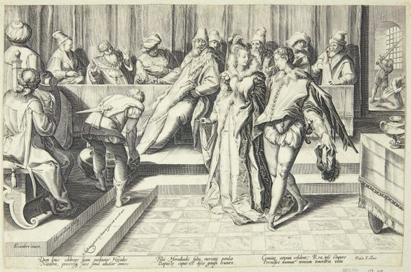 Curator: Ah, yes, "The Wedding Party" by Willem Cornelisz Duyster. He created this bustling scene with oil paints back in 1625. It now resides here at the Rijksmuseum in Amsterdam. Editor: You know, my first thought seeing this is how… staged it feels. Everyone’s arranged, not quite connecting. Like a perfectly crafted performance where the energy's a bit off. Curator: Exactly. Duyster’s paintings often explore social dynamics and decorum. This genre scene isn’t just about celebrating a marriage; it’s meticulously showcasing status and conveying social roles. The dark clothing contrasts so vividly with the bright, elaborate ruffs of lace. These function as more than mere fashion; they denote affluence and societal position. Editor: That checkered floor pulls my eye—a deliberate move, don’t you think? It throws everything else off-kilter and almost carnival-esque, undercutting any highbrow stuffiness the clothing suggests. It injects this playful unease to an otherwise quite serious affair. Curator: The checkerboard floor is a deliberate choice indeed. Think of vanitas symbolism, where contrasting dark and light suggests moral ambiguities, hinting at the impermanence of material joys and moral complexities present in a formal gathering. It is subtle, and would have communicated far more intensely to an contemporary observer than it does to us now. Editor: Okay, okay, I see the somber moral lesson poking through the fancy clothes. But look how separate everyone is—little clusters not quite interacting. That loneliness amidst all the splendor feels very modern, don't you think? Almost ahead of its time. Curator: Loneliness amidst splendor. That’s an astute observation. Although group portraits of the era frequently presented subjects somewhat formally, conveying more than individual emotion and rather social interconnectedness or class position within the societal fabric. It echoes concepts that would permeate painting throughout history—the complex relationships and hierarchies in human society. Editor: I like it. It's a bit sad, and that’s what makes it sing. A hidden whisper amid all of that apparent celebration. Curator: Duyster really invites us to peer closely, to find meaning interwoven through gesture, attire, and placement. Thank you for sharing your keen eye. Editor: Thanks for giving me the symbolic back-story. This piece went from staged and stilted to a surprisingly emotional tableau.