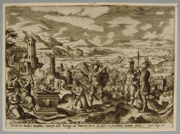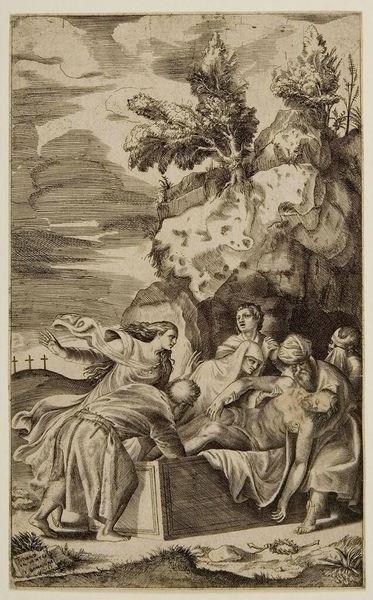 Editor: Here we have Claude Mellan's "Christ Carried to the Grave." It's hard to put my finger on the exact date, but the somber mood is undeniable. What's your take on this striking image? Curator: It reminds me of a stark dreamscape, doesn't it? Mellan, with his almost surgical precision, etches not just a scene, but the very air of grief. That single, swelling line he uses…it’s as if the sorrow itself is given form. Does it speak to you of resilience, perhaps? Editor: Resilience? I was stuck on the gloom, but I see what you mean. The unwavering line does suggest a kind of strength, even in sorrow. Curator: Precisely! It’s in the unwavering gaze of that figure by the tomb. Mellan's etching doesn't wallow; it witnesses. It makes you want to look closer, think deeper, maybe even draw your own line of hope.