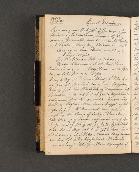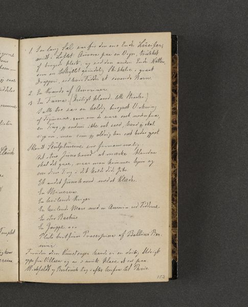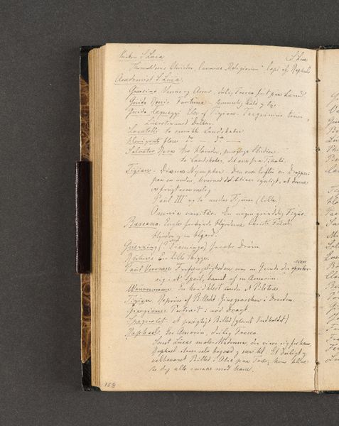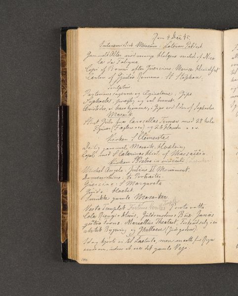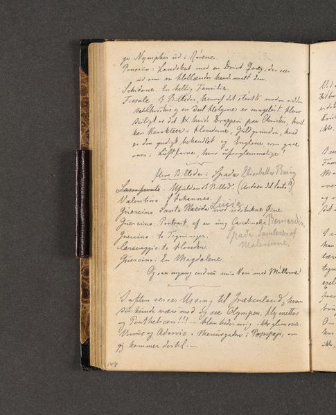 Curator: This is a page from Johan Thomas Lundbye's "Rejsedagbog," or travel journal, created in 1845. Editor: Immediately, I'm struck by its intimacy—the dense script and aged paper. It feels incredibly personal, like a window into the artist’s mind as he experienced a particular moment. Curator: Lundbye was a central figure in Danish Romanticism, known for his landscape paintings. But here, within these pages, we see something different—raw observations, sketches perhaps, acting as annotations to his journey. He visited various locations on his travels. Editor: Look at the composition – dense, almost chaotic in its arrangement of text. What do you see in the structure, the lack of a traditional frame? Curator: Indeed, the composition feels informal. He is listing locations like the Barberini and artworks by Raphael and Bellini among others. These lists become spatial experiments that invite multiple readings. The layering implies the flurry of thought. He also wrote in dense lettering, with minimal editing and minimal spatial awareness on the page. Editor: This connects to the broader social and cultural history of travel. These were common aristocratic, European practices. The journal format allows him to be subjective and fragmented in ways that his finished paintings would never be. Curator: You are quite right. There’s an openness in this document; we see him processing information and impressions, not just recording a finalized view. Editor: It also raises questions about how artists consumed and documented visual material. We gain rare insight into their methodology. How did these notations impact his finished pieces? The very act of inscription transforms both memory and experience. Curator: I think the effect is of lived experience—more visceral than aesthetic. To revisit this artefact offers us a way to think about what artists' journals can show us today. Editor: Exactly. It challenges traditional art historical approaches that overemphasize finalized work. It is a glimpse behind the scenes, humanising the artistic practice and reminding us that even Romantic giants wrestled with daily recording.