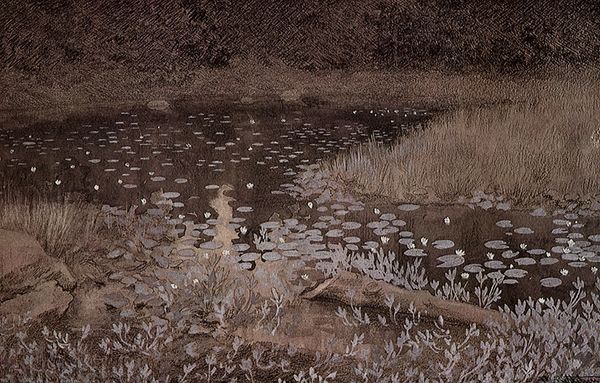 Curator: Looking at "Water Lily Pond, Ashumet Farm, Hatchville," a 1932 gelatin-silver print by Dorothy Norman, my immediate impression is one of quiet meditation. The monochrome tones give it a timeless quality, almost like a memory captured in light and shadow. Editor: Indeed. I see something both peaceful and almost unsettling. The dark reeds standing sentinel amidst the water lilies evoke a sense of enclosure. Norman presents the natural world not just as something beautiful, but as a space with its own inherent power dynamics and social history. Curator: Exactly! Water lilies, since ancient Egypt, symbolize creation and rebirth, and these plants push through murky water to blossom – representing spiritual ascent. Norman, given her deep interest in spiritual philosophies and Eastern thought, surely played with this symbolism. Editor: I'm intrigued by the choice of Ashumet Farm, Hatchville, as the site. How might this specific location contribute to the overall meaning? Farms at that time reflected broader socio-economic changes; consider the impact of the Great Depression and evolving rural life. Does it mirror controlled nature? Curator: Interesting. Beyond those tensions of environment and economy, let’s focus on the lily pads themselves, a flattened landscape upon which the delicate lily flowers perch. In many cultures, the lotus, closely related to the water lily, appears in the context of purity. By photographing at this specific locale, is Norman reinterpreting what sacredness truly entails? Editor: The soft focus further obscures a documentary approach, pushing it towards personal expression. Norman, even whilst embracing Modernist principles, seems aware that landscape has always been politically loaded in art, conveying ideologies tied to nation and ownership. Curator: It brings us back to that unsettling element you felt initially, doesn't it? There’s more here than first meets the eye: those shadows playing against the water lilies imply something latent and possibly enigmatic hidden beneath the tranquil surface. Editor: Ultimately, Norman uses familiar pastoral imagery to address pressing historical and perhaps psychological concerns. By looking closer, we reveal art’s purpose in expressing complex truths, reflecting the anxieties that affect even our vision of beauty.