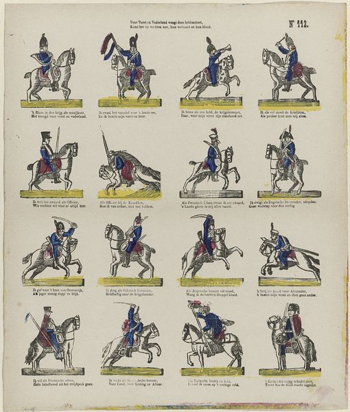 Curator: Well, this print, titled "Hier ziet ge de kleedij, der mannen die voor dezen, bij menig groote strijd de vijand deden vreezen," dating sometime between 1827 and 1894, and credited to M. Hemeleers-van Houter, showcases a collection of military figures. It's a fairly straightforward historical document rendered through engraving. My initial sense is that the use of blue, red, and yellow give a rather naive quality despite its apparent historical ambition. Editor: It certainly has an appealing graphic clarity. I see each uniformed figure on horseback repeated, almost like toy soldiers lined up. Is there a cultural resonance to the depiction of these figures; is there a shared language embedded in them? Curator: These are depictions of high-ranking military men: Generals, Colonels, each figure represents a different rank and probably a different regiment, judged from the variation in their attire. We're looking at more than simple military portraiture, and can think of it more as visual rhetoric meant to remind its viewers of its historic battles, to glorify it even. The engravings, especially if this image circulated widely, shaped public imagination regarding past glory and helped foster sentiments of patriotism. Editor: It strikes me, though, that while these figures brandish swords and adopt heroic poses, the medium—engraving—and the style, described as Romanticism, lend a certain idealized softness. Perhaps the combination served to distance viewers from the grim realities of battle, instead encouraging a heroic interpretation of sacrifice. Curator: Absolutely. These aren't meant to show the ugly truths of war. We are witnessing here an attempt to cultivate a visual language that builds the romantic narrative. Even something as simple as color serves this. Notice how red isn't just a visual descriptor, but implies heroism and power through visual coding. It would resonate with the viewer because color carried cultural information in this specific context. Editor: And looking at this piece again with fresh eyes, I consider how art is not simply reflective; pieces such as this participated in shaping ideologies about history, memory, and a society’s perception of heroism, specifically for Dutch national identity at that moment in time. Curator: Exactly! It underscores how visuals act as a potent reminder—sometimes prompting a romantic, constructed recall of the past for building present sentiments, not always providing facts as they happened. Editor: In essence, even ostensibly 'documentary' artwork functions as powerful, actively formative tools within any given historical moment. It gives a far deeper and layered significance to pieces that, initially, we may casually categorize as belonging simply to history. Curator: Well said. Indeed. It also adds a touch of poignant recognition when standing here reflecting on this artist and her art that reminds us, perhaps, that history is never simply factual recall, it is active ongoing creation.