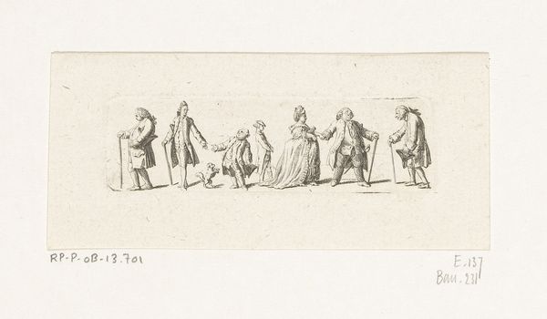This is a pen and ink drawing called ‘Karikaturen,’ by Daniel Nikolaus Chodowiecki, made in the late 18th century. Chodowiecki was a significant figure in the Berlin art scene, known for his detailed and often satirical depictions of middle-class life. The drawing presents a series of caricatured figures engaged in various activities, offering a glimpse into the social customs and pastimes of the era. Made in Germany, during the Enlightenment, this artwork can be understood through the lens of social commentary. The artist's choice to depict everyday life, with its follies and pretensions, reflects the values of the Enlightenment, such as reason and observation. The rise of the middle class in Europe also gave rise to new forms of art consumption and new artistic subjects. The institutions of art, like the Berlin Academy of Arts, played a key role in shaping artistic taste and promoting certain styles. To fully appreciate this work, one might consult historical documents, social histories, and art criticism from the period.