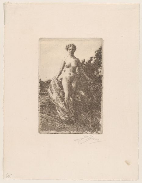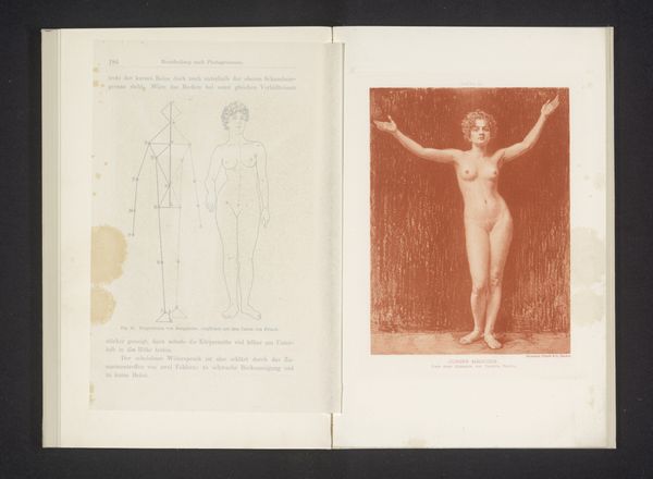 Curator: Here we have "Reproductie van een ontwerp van een vrouwelijk naakt op de rug gezien door Cornelia Paczka", or "Reproduction of a Design of a Female Nude Seen from the Back by Cornelia Paczka." It's thought to have been made before 1899. You'll notice that it is a drawing, a print, specifically an etching, done on paper. Editor: The immediate impression? Faded grandeur, almost like looking at a ghost through layers of time. The ochre color feels very specific to that period. Curator: Indeed, the Symbolist movement was at its height then. Notice how the figure seems almost to emerge from or dissolve into the background. This technique often represented themes of mortality and spiritual awakening. Also notice there appears to be another rendering on the adjacent page. It looks as though this book contains studies or preliminary images. Editor: Ah, so the first faint rendering could also indicate this artist was still "forming" the figure. We are literally looking at her discovery. Do you think that slightly awkward arm positioning is intentional, or the nature of the draftsmanship? Curator: Possibly both. Academic art often leaned on idealized forms. Any slight deviation could be either intentional for effect, or just the artist's limitations. The light colour contributes to the overall ethereality; it nearly dematerializes the subject. Editor: Absolutely. It invites questions of permanence and memory—how much can be held, how much fades? Does she want to stay or disappear? I also like how she almost holds up her hands to create a kind of frame for her form... as though the artist felt the need to define her boundaries against oblivion. Curator: Yes, there is a tension in this piece between capturing and releasing, which might well symbolize the artistic struggle itself. Editor: I appreciate how such a quiet piece can whisper so much about the weight of existing. It's strangely comforting. Curator: It shows us how, through imagery, even the fleeting can leave a profound imprint.