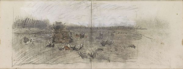 This is Jacob Maris' watercolor, "Landschap met ploegende boer", or "Landscape with Plowing Farmer," housed here at the Rijksmuseum. Observe how Maris orchestrates a symphony of muted tones, primarily grays and browns, that evoke a sense of somber tranquility across the Dutch landscape. The composition is divided horizontally, with the lower portion dominated by the dark, tilled earth and the upper half by an overcast sky, creating a sense of weightiness. The stark, bare trees punctuate the horizon line, their verticality contrasting with the horizontal expanse of the fields. Maris seems less concerned with depicting a literal scene, and more interested in conveying an emotional state through the structural arrangement of form and color. The figures of the farmer and horses are integrated into the landscape, underscoring a connection between humanity and nature. There is a poetic sensibility in how Maris uses the watercolor medium to suggest atmosphere and light, engaging with ideas about Romanticism and its emphasis on emotion.