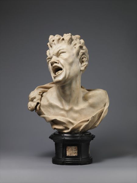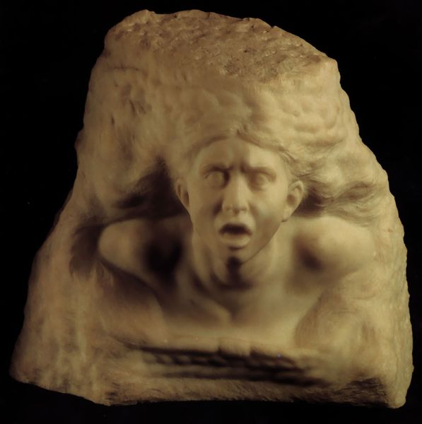 Curator: Here we have Auguste Rodin’s marble sculpture "Head of Saint John the Baptist," created in 1887. The piece offers a powerful glimpse into Rodin's unique style. What is your initial read of it? Editor: The immediate feeling is one of profound melancholy, wouldn’t you say? His closed eyes suggest inward contemplation, but the open mouth, slightly agape, hints at suppressed agony or a silent scream. The unfinished edges around the face, that rough, almost violent texture, intensifies the raw emotion, don't you think? Curator: Absolutely. I find the symbolic weight heavy indeed, John the Baptist as the archetypal herald silenced too soon, his message curtailed. The slightly upward tilt of the head has been interpreted as anticipation or perhaps even a vision, but as an artist, I wonder if he was attempting to create a specific vision? Perhaps just feeling. Editor: Or is it the very moment of his martyrdom captured? The head severed, raised up in reverence but also a ghastly image of sacrifice? Marble, so often used for idealized forms, here feels brutally honest. And look how Rodin allows the unworked stone to remain, as if to underscore the incompleteness, the brutal ending. It becomes symbolic of the unfinished nature of his message and destiny. Curator: Yes, but at the same time there is grace here, I find. His beard is more symbol than actual beard! Perhaps the simplification emphasizes John's unwavering devotion even in death. It seems Rodin found him an endless fascination, as the Head can be considered related to a complete standing John, and later used as an expressive piece as you see him here. Editor: Interesting! The choice of depicting John specifically seems very deliberate, knowing Rodin's fascination with suffering. The open mouth as a symbol isn’t passive—it actively cries out against injustice. It places John as a perpetual figure of rebellion, eternally resonating in the cultural imagination. Even severed, that voice, however muted, continues to speak through this powerful symbol. Curator: I'm glad to find new interpretations! Rodin leaves room for us all to grapple with this haunting figure. Editor: Indeed! And allows this "head" to carry so much symbolism. Thank you for walking us through!