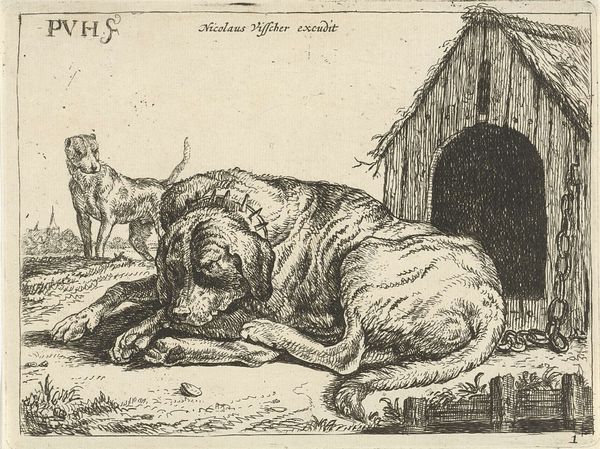 Jan Dasveldt etched this image of a barking dog near a kennel, capturing a common scene with symbolic undertones. The dog, an emblem of vigilance and loyalty, stands guard, its bark a primal warning against the unknown. This motif of the watchful canine echoes through art history, from the Cerberus guarding the gates of the Underworld in ancient Greek pottery to the faithful companions in Renaissance portraiture. Yet, consider how the depiction of dogs has shifted; initially symbols of fidelity and guidance, they also bear the weight of aggression and the untamed. The snarling dog taps into our collective memory of fear and protection, reflecting a complex relationship with the animal world. The emotional intensity of the dog's bark resonates on a subconscious level, stirring deep-seated instincts. This image reveals the cyclical nature of symbols, their meanings evolving and layering across centuries.