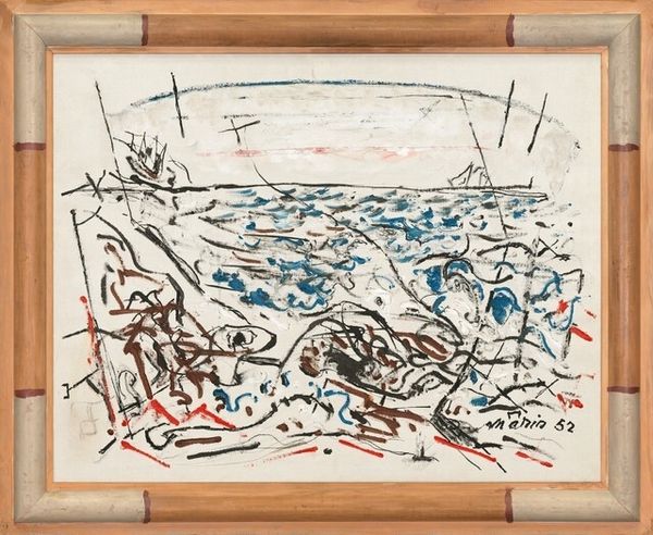Editor: This is John Marin's "Autumn Coloring No. 4" from 1952, it’s an oil painting and watercolor. The textures are pretty striking; the blues are like little punches of energy against the overall muted palette. What do you see in this piece? Curator: I am intrigued by how Marin utilizes compositional tension in "Autumn Coloring No. 4." The placement of the square, off-center, creates a visual imbalance. Furthermore, the brushstrokes are fragmented; what do you make of their contribution to the overall structure? Editor: They make me feel the speed, like a fleeting impression of a landscape, not something solid. Like he’s trying to capture the energy of autumn rather than a literal scene. Do you think that was intentional? Curator: Undoubtedly. Observe how the planes of color interact; the blues juxtapose against the ochres and greys. Semiotically, each hue contributes to a fragmented representation. This intentional fracturing rejects a conventional pictorial structure, and invites deconstruction. Editor: So it's not just a picture of something, but an idea *about* how we see? Curator: Precisely. It beckons the viewer to participate actively in the image's construction. The essence is a pure experience, devoid of superficial subject matter. Editor: So, focusing on just the brushstrokes and colours… it’s almost like a musical score, the way they build on each other. Curator: An astute observation! Thinking of this painting as musical resonates – one might view those dashes of blue as percussive accents that provide dissonance and momentary disruption. Editor: This really makes me see abstract art in a new light. I guess I was too focused on looking *for* something instead of looking *at* something. Curator: A very insightful realization! And hopefully, one you'll carry with you as you keep learning.