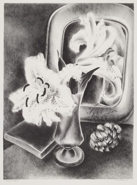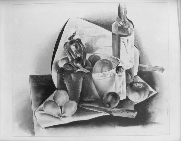 Editor: This drawing is titled "Summer Lunch." It’s a charcoal and graphite work, and its artist is Minnetta Good. I’m really struck by its formal arrangement. Everything seems very deliberately placed, almost staged. What do you see in this piece? Curator: I see echoes of vanitas still life paintings. Consider how, even without explicit symbolic objects like a skull, the careful arrangement, the ripeness of the fruit – particularly that fig – evokes ideas about the fleeting nature of beauty and the transience of life's pleasures. Editor: The fig does look about to burst, doesn't it? Like it's at its peak, but about to decay. Curator: Exactly. Think about the specific cultural weight of each element. The fruit could represent abundance, but also vulnerability. The tableware, symbols of civilization, perhaps hint at something more structured being built on top of something naturally chaotic. How does the stark contrast in light and shadow affect your interpretation? Editor: It creates a real drama, focusing my attention on specific textures like the grapes and silverware while letting the background fade away. Does the lack of color influence that reading? Curator: Definitely. The monochrome palette forces us to look beyond mere representation and to engage with the underlying symbolic framework. The interplay between light and dark becomes crucial in highlighting the objects' textures and shapes, ultimately guiding our understanding of their deeper meanings and cultural connections. What do you take away? Editor: I see that each element—the fruit, the vessels, even the crisp white cloth—isn't just a visual object. They speak to cycles of life, sophistication, and impermanence in an accessible way. Curator: Precisely. "Summer Lunch" reminds us that even seemingly simple images can hold layers of cultural memory and complex emotional narratives.