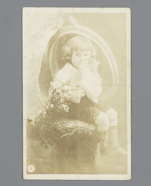 Curator: This is a photograph entitled "Model met geborduurde jas en muts van de Wiener Werkstätte," placing it sometime between 1920 and 1930. The work is housed here at the Rijksmuseum. Editor: There's something so delicately haunting about this image. It reminds me of a vintage doll, with its button eyes and a certain posed stillness. Curator: The subject here models clothing designed and produced by the Wiener Werkstätte, an association of visual artists, architects, and designers influential in the Art Nouveau movement. Consider this through the lens of design history. What can this image communicate to us about early twentieth-century aesthetics and class? Editor: Hmm, those patterned trims feel very handmade somehow, juxtaposed against the crisp, almost too-perfect presentation, especially those perfect shoes! It’s charming, though…makes me wonder about the little model. I hope their rabbit wasn't too ticklish! Curator: The Wiener Werkstätte aimed to integrate art into everyday life, promoting a unified artistic vision across all aspects of design. This child, adorned in bespoke attire, symbolizes a dedication to handcrafted luxury during a time of emerging industrialization. The context of early childhood portraits often intersected with statements about wealth, aspiration, and cultural values. Editor: And the teddy bear! Oh gosh, there's this wistful quality…the toy looking even more worn and loved against the clean backdrop… It tugs at something, you know? Did this feel as precious then, or does the passing of time turn it bittersweet? Curator: Exactly! Examining its photographic qualities – the soft sepia tones and meticulous staging – invites us to unpack prevailing beauty standards, power dynamics, and historical frameworks that shaped these visual representations. The image, in its gentle innocence, also silently highlights larger social inequalities. Who had the access, resources, and societal standing to participate in the lifestyle implied here? Editor: It also feels like they have captured something other than just finery, a tender moment… like they almost weren't ready, they caught her there not fully 'performing', and so maybe that's why this moment speaks through time with its little hand hugs and half smiles... Curator: That's an interesting point – seeing this image through a psychoanalytical frame brings in questions around affect, vulnerability, and desire, disrupting a potentially conservative read of wealth. The beauty and privilege become complicated… Editor: It leaves one lingering, right? Long after we wander into another room...a gentle reminder of worlds lived in. Curator: Agreed. A silent, beautiful photograph that encourages us to weave these threads of history, design, and affect into a nuanced appreciation.
