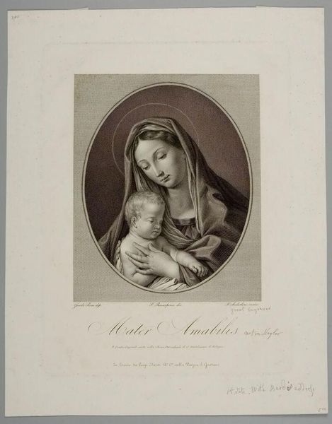Editor: Here we have Raffaelle Granara's "Madonna and Child," housed at the Harvard Art Museums. The tender embrace is lovely, but the woman's expression seems… melancholic. What do you see in this piece? Curator: I see a reflection of societal constraints placed upon women, even within the idealized role of motherhood. The Madonna's sadness, framed within this patriarchal narrative, speaks to the loss of autonomy inherent in the female experience. The gaze directed downward signifies both tenderness, but also, perhaps, a sense of resignation. Editor: Resignation? That's a powerful way to put it. Curator: Consider the lack of agency afforded to women throughout history. This image, while seemingly pious, underscores the limitations imposed upon them. Editor: I hadn't thought of it that way. It's so much deeper than just a pretty picture. Curator: Precisely! Art invites us to question, to challenge, and to connect the past with the present.