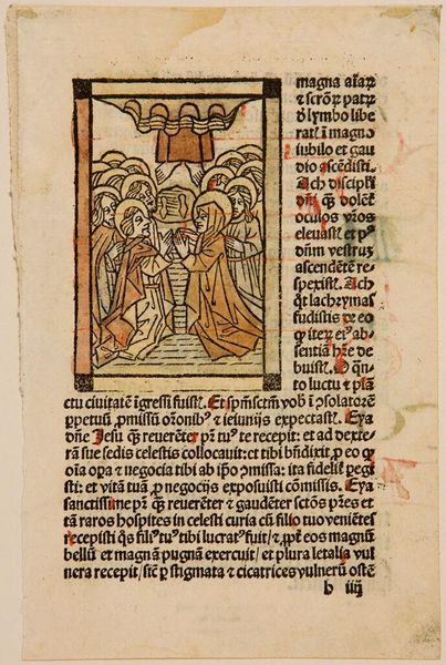 Curator: This is Illustration XIX, currently held at the Harvard Art Museums. It's an intriguing piece made by an anonymous artist, we can only assume during the medieval period. Editor: My initial feeling is one of subdued tension. The figures seem confined within the frame, their expressions a mix of contemplation and apprehension. Curator: The use of woodcut printmaking is significant. The deliberate lines and texture, likely hand-colored, tell us much about the printmaking processes and distribution of religious imagery at the time. Editor: Absolutely. And considering its potential function as a devotional image, the piece likely served as a tool for reinforcing specific theological perspectives and social norms around piety and suffering. The suffering is palpable. Curator: Indeed, these smaller, portable images would have been circulated widely, allowing for personal and communal experiences of faith. Editor: Looking at it now, I’m reminded of the power of art to reflect and shape societal values, even—or perhaps especially—in anonymous works like this one. Curator: A great point, it's so easy to overlook the impact such a small illustration would have had.