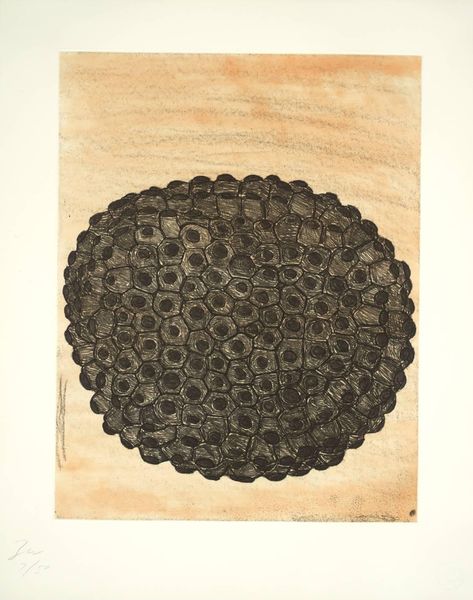 Curator: Terry Winters' "Album #7" presents us with an intriguing image, a roughly spherical form dominating the composition. What's your initial reaction to this piece? Editor: It feels contained, almost claustrophobic. The sphere’s mosaic pattern is unsettling, like a decaying cell magnified under a microscope. I'm drawn to the stark contrast in tone. Curator: Winters, born in 1949, often explores organic forms and systems. His process involves layering and building up marks, which reflects the processes of growth and decay, a commentary on the natural order. Editor: The dripping ink at the bottom contradicts the controlled geometry of the sphere. The contrast emphasizes its artificiality, suggesting a tension between nature and imposed order. Curator: Absolutely, and the monochromatic palette focuses our attention on the textures and subtle tonal variations achieved through the medium. Editor: It's a bleak but compelling vision, a frozen moment hinting at larger processes and the materials that give the piece a distinct texture. Curator: Indeed, a stark reminder of the materials and natural processes at play.