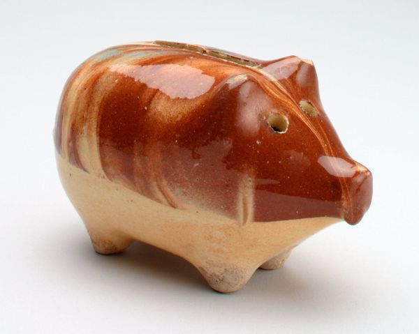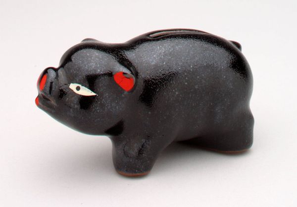 Curator: This charming object is titled '-Oriental Elephant- still bank,' dating to around 1930. It resides here at the Minneapolis Institute of Art. Editor: It’s…remarkably orange! A single, bold hue dominates this little elephant. Ceramic, judging from the sheen? It evokes a sense of playful functionality; I can almost hear the clink of coins inside. Curator: Indeed! What strikes me is how this object navigates notions of Orientalism popular during the early 20th century. Elephants, of course, become symbols of exoticism. Consider the sociopolitical role such objects played, often reinforcing prevailing perceptions, however inaccurate. Editor: From a material standpoint, ceramic was widely accessible, making this a potentially mass-produced item, perhaps destined for middle-class homes. The very *process* of molding, glazing, and firing dictates much of the design, wouldn't you agree? Simplification of form becomes a necessity. The bold orange is likely an inexpensive, stable pigment for widespread application. Curator: I think you hit an important point, it does indeed speak to issues of accessibility. Its function as a coin bank merges art with everyday utility, influencing, on a much larger level, the commercial markets that museums navigate. Editor: And what labor went into its manufacture? The making involved specific artisanal or even factory-based skills. Where exactly was it produced, and by whom? What were their working conditions? Did they have ties to colonial industries? Curator: Those are difficult but essential questions, leading us to explore this elephant’s journey from a maker's studio to a child's bedroom, reflecting, on a small scale, shifts in industrial processes. I find its survival into the present so potent, its presence in the museum re-contextualizes it within a grander, historical arc. Editor: Exactly! And let's not forget the consumers. What value did they place on saving money in such a culturally charged object? Did its appeal stem solely from practicality, or was there a desire to engage with these distant, “oriental” lands? A curious collision of savings and symbol, really. Curator: A truly engaging collision, reminding us of the power an ordinary object possesses, and how folk art can often illuminate major cultural histories. Editor: Indeed. And it encourages us to reconsider the boundaries of art, consumption, and the often obscured realities of production.