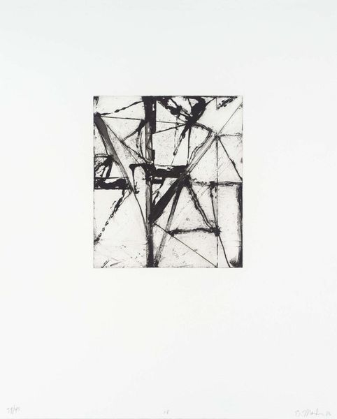 Curator: We're looking at Brice Marden's piece, simply titled "20," held within the Tate Collections. It's a modest-sized print, roughly 200 by 177 millimeters. Editor: My first impression is one of stark contrasts. The bold, black lines against the white create a dynamic tension. It feels unresolved, somehow. Curator: Yes, Marden's deliberate use of line and form invites contemplation. The division into two panels is crucial, creating a visual dialogue between the two halves. Editor: I see a certain rawness, almost like a blueprint. Perhaps Marden's playing with the idea of deconstructing formal artistic language itself. What role do museums play in exhibiting these kinds of minimalist expressions? Curator: Museums provide a space for viewers to engage directly with the artist's intent, to appreciate the nuances of line, texture, and spatial relationships. It’s about experiencing, rather than interpreting. Editor: So the museum is not just a preserver of art but also a stage for experiencing it anew. Well, that has certainly given me a different perspective.