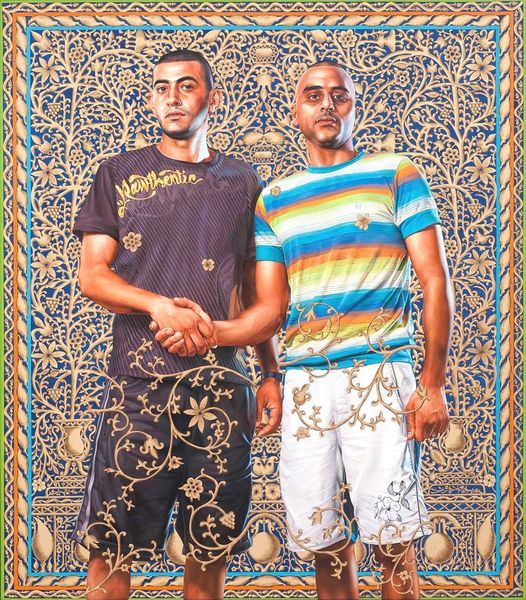 Editor: We’re looking at Kehinde Wiley's "Hamza El Essawi," created in 2011. It seems to be a mixed-media painting – so vibrant! I’m immediately struck by the juxtaposition of the subject's casual, almost contemporary, appearance with the ornate, classical backdrop. How do you unpack all those layers? Curator: Ah, Wiley, a master of visual conversation! To me, it's like Wiley's having a cheeky chat with art history. He's plucking these everyday folks, often from the streets, and popping them into these grand, history-soaked poses and backgrounds that used to be reserved for royalty and saints. What do you make of Hamza’s expression, posed so coolly against all that grandeur? Does it resonate differently seeing him 'elevated', so to speak? Editor: It does! He’s… almost daring you to question his presence there, like he owns it. It's definitely a power statement, but also makes you think about who gets to be represented in art, and in what way. I am also intrigued about why the foliage is placed on top of the body rather than in the background only. Curator: Exactly! Wiley turns those traditional power dynamics on their head, doesn't he? As for the overlay of foliage, think of it as this...a gilded hug from art history. It obscures slightly, while also elevating and decorating his form as the gold accentuates the overall effect in line and mood. Its a conversation between street style and old master aesthetics – the familiar made magnificent, almost mythic. Is it effective, would you say? Editor: Absolutely! It’s provocative and gives you so much to think about. I now understand that It's a dialogue between past and present. Curator: Couldn’t agree more. I come away reminded that the power of art isn't just in what we see, but how it makes us see. Editor: Definitely a new way to look at portraiture! Thanks for helping me see what makes Wiley's work so amazing.