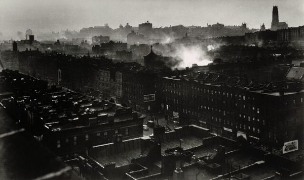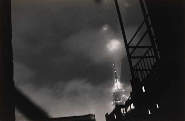 Editor: We're looking at "Frisco Railway Station, Fort Scott, Kansas", a gelatin-silver print by Gordon Parks, made sometime between 1950 and 1958. I'm really drawn to how the wet platform creates this distorted reflection, almost dissolving the figures into the scene. What do you see in this piece, considering its formal qualities? Curator: Immediately, the stark contrast in the monochromatic palette arrests the eye. The interplay of light and shadow is expertly handled. Notice how the reflection you mention not only distorts, but it also fractures the already receding space, adding depth to the image. The linear quality of the train, platform, and station roof create these repeated lines, drawing the eye to the vanishing point and emphasizing the work's planar organization. How does the texture influence your understanding? Editor: The smooth, reflective surfaces of the wet platform against the grainy texture of the sky create a sort of tension. Does this tension speak to some kind of narrative? Curator: That's a astute observation. Formally, that tension functions as a visual dichotomy. One cannot ignore the geometric precision, contrasting against what seems like a softened sky by what might be steam. This interplay prevents the scene from flattening out and gives an emotional weight to the overall impression, due to the chiaroscuro. Editor: I hadn't considered how the composition itself contributed to the overall mood. It makes me consider how Parks was intentionally playing with these contrasts. Curator: Exactly! Through analyzing line, light, shadow, and texture we reveal Parks' aesthetic decisions and arrive at a deeper engagement with the work. What have you discovered? Editor: I’m recognizing the value of studying texture, line and shadow to uncover what really attracts me to a photograph. Thanks! Curator: The close observation of intrinsic visual properties has expanded the interpretive possibilities, which deepens my experience, too.