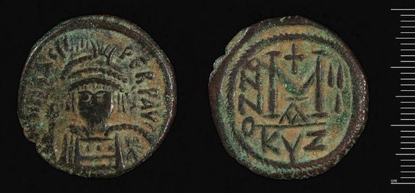 Curator: At first glance, the coin evokes a sense of profound antiquity, a relic worn smooth by the passage of countless hands. Editor: Indeed. What we have here is a coin of Justinian I, held in the Harvard Art Museums. Although undated, these coins were a vital tool for his administration. Curator: The symbolic weight is palpable. Even in this state of wear, the emperor’s image and the cross he bears are clear emblems of power and faith. The drilled hole speaks to its life beyond currency, perhaps as a personal talisman. Editor: Absolutely. These coins were more than just currency; they projected the emperor's image and legitimacy throughout his vast empire. The use of his portrait links directly to imperial power. Curator: The green patina adds to its mystique, a testament to its journey through time and the chemical embrace of the earth. This humble object resonates with echoes of an empire long past. Editor: It's incredible to consider how something so small circulated within the grand narrative of Byzantine history. It reminds us that art serves many roles, from propaganda to personal adornment.