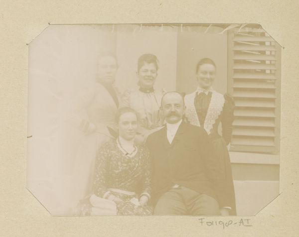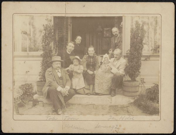 Editor: Here we have "Groepsportret van pastoor Bercio met zijn familie in Klein Koslau," taken sometime between 1890 and 1910. The photograph presents a family gathering. There’s a formality to it, but what strikes me is the texture – the clothes, the foliage in the background, and even the aging of the photograph itself. How do you approach a piece like this? Curator: This photograph allows us to consider the material conditions of portraiture at the turn of the century. Think about the clothing; the heavy wool suits and elaborate dresses. These weren’t off-the-rack items. The very act of commissioning such garments signifies a certain level of economic privilege and a specific labor infrastructure required to produce these elaborate designs. Editor: So, the image speaks to the economics of the time. Curator: Precisely. The photographic process itself involved significant material resources – glass plates, chemicals, and the specialized knowledge required to operate the equipment. The final print then needed to be mounted and preserved. It was an investment, intended to communicate a message of status and familial unity. Consider the limited mobility required by those photographed. The subject sat, labored over the still image, creating value and demanding attention. Editor: I hadn't considered the materials and processes so directly contributing to the photograph’s meaning. It’s fascinating to think of it less as a candid moment and more as a product of material constraints and social pressures. Curator: Exactly! By focusing on the materials, we shift from viewing it solely as a quaint family portrait to understanding it as a tangible artifact embodying social and economic forces. What lasting thought does that understanding give you? Editor: I am considering the economics behind who and what is captured when creating art. This changes my consideration when viewing. Thanks!