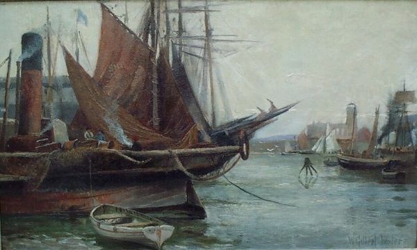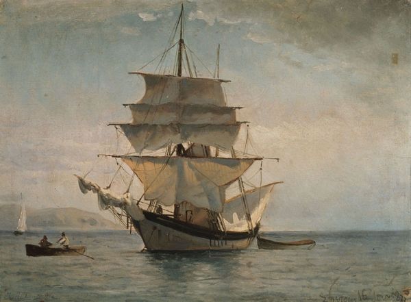 Amaldus Nielsen painted this oil-on-canvas titled "Kleven, Mandal," which presents us with a compelling interplay of light, form, and structure. Predominantly, the scene is dominated by the vertical thrust of sailing masts and the billowing forms of the sails. This generates a sense of romantic grandeur. Nielsen's brushstrokes, particularly in the water, give a textural quality to the piece. This disrupts any sense of a smooth, continuous surface. This is also visible in the sky, where the colors are blended with subtle gradations to evoke atmosphere. The use of reflected light on the water's surface is not merely representational, but symbolic. It highlights the painting's construction, emphasizing the act of seeing and interpreting the natural world through artistic means. Nielsen thus offers a structured vision that engages the viewer in a dialogue about the nature of perception and artistic expression. The artwork, therefore, functions as a philosophical exploration of vision itself.