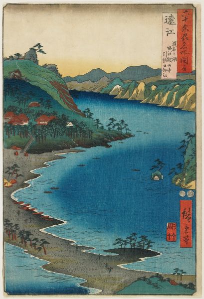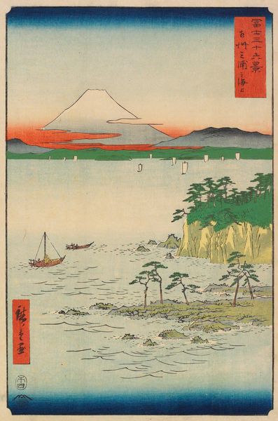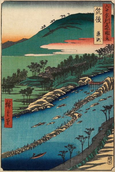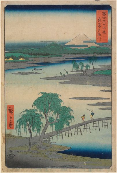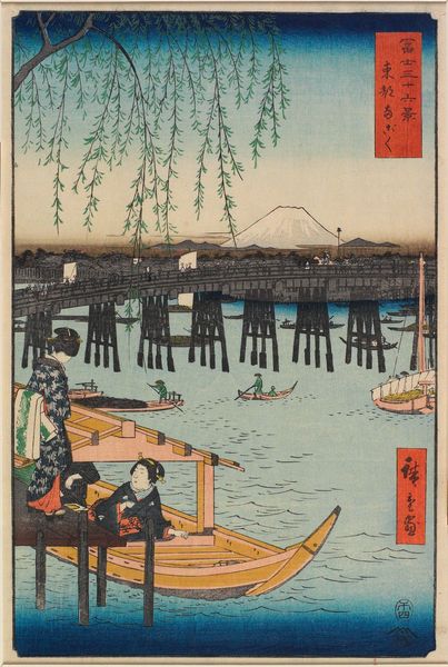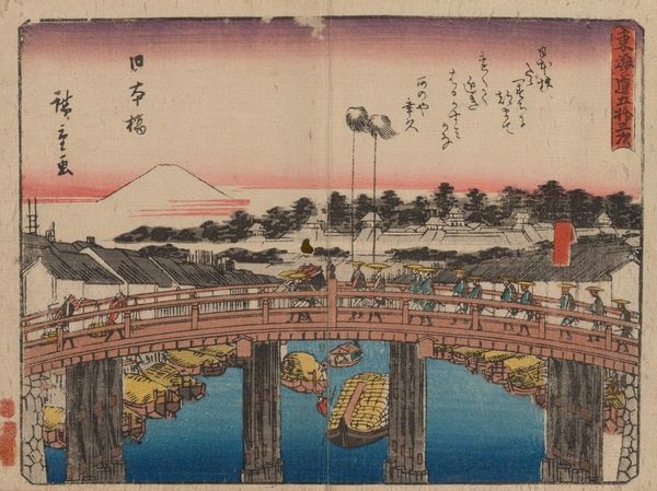 Curator: Here we have Utagawa Hiroshige’s "Ichikokubashi Bridge in the Eastern Capital," likely created around 1858. The artwork is currently held at the Minneapolis Institute of Art. Editor: What strikes me immediately is how active the print feels despite the serene landscape in the background. Look at all that textural detail on the bridge—you can almost feel the grit of the wood! Curator: Yes, Hiroshige was a master of Ukiyo-e, or "pictures of the floating world." These prints became hugely popular among the merchant classes during the Edo period. This work provides an interesting snapshot into how the urban landscape became part of mainstream art consumption. Editor: Definitely. And the attention to the making process is very revealing. The woodblock technique itself allowed for the mass production and dissemination of such imagery. Notice how the color palette emphasizes the industrial textures against the softer background gradients. Curator: Exactly! The choice of imagery—everyday city life—along with this particular method of printmaking democratized art consumption. These prints weren’t just for the elite. This specific bridge, located in Edo, what we now call Tokyo, served as a major artery. Its depiction here speaks to the evolving urban experience. Editor: Speaking of the urban experience, the composition highlights a vibrant working community crossing the bridge, hinting at bustling marketplaces and active laborers supporting the developing city. What stands out to me is the stark materiality compared to the mountain in the distance, where the workers navigate their daily toil, bridging nature with the needs of a rapidly changing urban landscape. Curator: Well put! This wasn’t simply landscape art; it’s a portrayal of a dynamic society undergoing significant change, framed by the political and economic realities of the time. Editor: Considering how meticulously each aspect of urban development is illustrated, from laborers navigating to resources piled up on the riverbanks, Hiroshige doesn’t only give us a visual experience. He shares tangible reflections about the industrial labor enabling urban existence during that period. The materiality itself carries so many messages about everyday society. Curator: Indeed, and reflecting on this print reminds us of the power art has to capture social transitions. Editor: I’m walking away pondering how processes shape perceptions and, in this case, the bridges that are made between people and place.