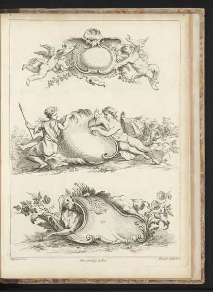 These designs for ornamental cartouches were etched by Gabriel Huquier in the 18th century. Note the prominence of heraldic symbols: the lion, the eagle, and the crown. Such symbols are ancient, dating back to antiquity, and were used to signify power, courage, and divine authority. Observe how Huquier arranges these symbols to create a sense of grandeur and prestige. The lion, a symbol of strength, has been a recurring motif in art and heraldry for millennia, from the ancient Near East to the royal courts of Europe. In contrast, the eagle, often associated with the Roman Empire and later adopted by various European monarchies, embodies imperial power and divine favor. The recurring use of these symbols speaks to a deep-seated human need for order, status, and connection to the past. The emotional resonance of these images lies in their ability to evoke a sense of pride, loyalty, and collective identity. These symbols, passed down through generations, tap into our collective unconscious, reminding us of the enduring power of tradition and the cyclical nature of history.