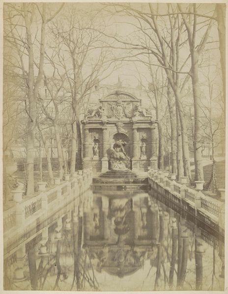 Curator: George Lodewijk Mulder captured this “View of a City Gate in Alkmaar” sometime between 1859 and 1868. It’s a gelatin-silver print photograph. Editor: It's strikingly symmetrical. The dark reflections in the water anchor the composition, and that arched gateway—it feels almost theatrical, like a stage entrance. Curator: Indeed, Mulder's work often intersected with Romanticism, highlighting picturesque and emotionally evocative scenes. Consider the labor and social context: Photography at this stage was complex, reliant on skilled practitioners and access to resources. Gelatin-silver prints allowed for finer detail and mass reproduction, democratizing access to imagery. Editor: I’m drawn to the light and shadow play, especially the gradations on the arch and in the water. The texture, too—you can almost feel the stonework despite the distance. Semiotics comes into play here; the archway itself signifies passage, transition…perhaps even aspiration. Curator: But the gate, like other remnants of fortifications, are ultimately built for defense and control. So, Mulder gives us a vision filtered by technical and social forces and we should be conscious of the photographic means of image-making and distribution which, from the start, served a particular kind of viewership and desire for the photographic image. Editor: A good point. Even the composition—the stillness of the water, the carefully framed architecture—presents a constructed ideal. The reflections are not simply reflections, they become symbolic weights. Curator: Yes, they mirror but do not perfectly replicate, acting as indexical documents with purpose and inflection, where labor practices are invisibilized. The final image served a new and expanding urban and middle-class population that sought out pictures like these. Editor: I keep circling back to that light. It models the stone, giving it such palpable form, contrasting with the amorphous, ever shifting reflection beneath. Curator: Studying this piece brings me to new ways of seeing the development of photography, but reminds us how photography is intertwined with shifts in the class structure and the economics of 19th century European societies. Editor: It underscores, too, the dialogue between technique, art, and the changing structures of feeling during the romanticism movement. Curator: A worthwhile observation. Thanks. Editor: Thank you.