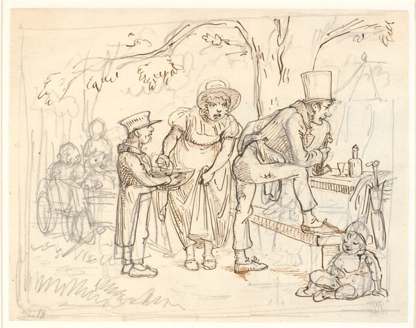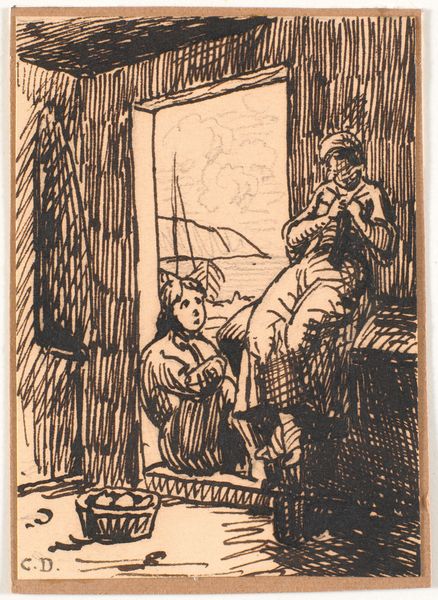 Editor: This is Martinus Rørbye's "Værkstedsscene," created in 1836 using ink on paper. It looks like a snapshot of daily life, perhaps in the Mediterranean, rendered in warm sepia tones. The figures seem caught in a moment of quiet industry. What formal elements stand out to you in this piece? Curator: Formally, I'm immediately drawn to the stark contrast between the highly detailed foreground and the somewhat indistinct background. Note how Rørbye uses cross-hatching to build volume and texture in the figures within the workshop. Observe the precise rendering of their clothing versus the more suggested forms of the landscape visible through the doorway. The composition invites inquiry as the figures lead the eye toward the background where a person with amphora stands near the coast line. Editor: That distinction is striking! So, you are speaking about the sharp line works as opposed to the softer use of tone? Also, it looks like some objects are strategically placed, right? Curator: Precisely! And consider the lines guiding the eye from left to right: the tools hanging, the figures working and resting and ultimately through the doorway, effectively orchestrating depth. It's less about illusionistic space and more about creating distinct formal zones, would you not agree? Editor: I see it now! I was so focused on the subjects. The composition almost divides into three horizontal zones, with the doorway acting as a liminal space between the two. It’s amazing how much is conveyed using simple materials. Curator: Exactly! And note how that tonal separation allows him to play with degrees of finish. A useful insight into the artistic strategy at play within Rørbye’s work. Editor: I had not considered that until now. Thank you for drawing my attention to that element in the piece! Curator: It's these subtle observations that reveal the sophistication within what might initially appear as a simple genre scene. The artist created tonal dynamics through skillful use of line to achieve complexity.