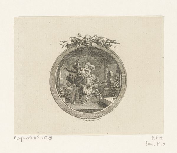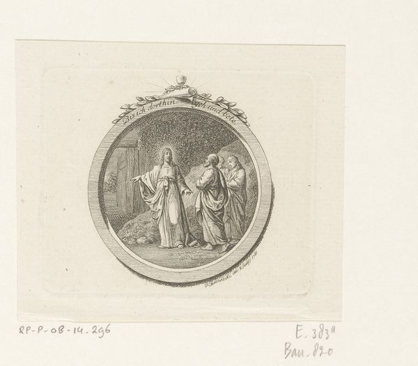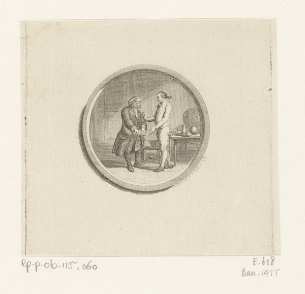 Curator: Looking at this etching, titled "Cyrus in gesprek met Daniël" ("Cyrus in Conversation with Daniel"), created by Daniel Nikolaus Chodowiecki in 1779, the neoclassical style immediately stands out. Editor: Yes, there's something so somber about it, despite what I imagine is supposed to be a moment of revelation. All those grey tones and precise lines convey a kind of… resignation? Curator: As a narrative print illustrating a biblical scene, Chodowiecki draws from a long tradition of visually interpreting scripture. Note how Daniel, on the right, gestures heavenward, bathed in divine light. The beam signifies the power dynamic at play here. Editor: It strikes me, though, that Cyrus, on the left, seems almost… resistant? His body language, though composed, hints at a conflict, or perhaps even an imposition of power that requires divine intervention to legitimize. It's as though he must accept a mandate, perhaps even reluctantly. Curator: That’s interesting. Within the visual language of the 18th century, that upwards gesture by Daniel was generally recognized as indicating the divine will. The scene recalls narratives of prophecy and validation of earthly rulers by spiritual figures. Remember, engravings like these would have disseminated ideas widely at the time. The light becomes a symbol of not only God's endorsement, but, in essence, an endorsement by the power structures that supported these visual narratives. Editor: It does make you think about the use of religion to legitimize political actions. The image hints at questions that echo across time – who interprets the divine will and whose agendas do they serve? Curator: A valid question. Though this image originates from the past, understanding its iconography invites contemplation regarding its influence and implications today. Editor: I'll leave with the thought that the tension apparent in the image is perhaps still with us, informing the debates on the relationships of governance, religious freedom, and cultural identity.