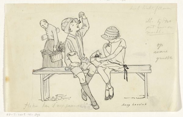 Editor: So, this is "Man brengt een toost uit op Pepita," a pen drawing by Hans Borrebach, made sometime before 1948. It’s a simple sketch, really, but there's something quite elegant about the figures, especially with that Art Deco flair. What kind of story do you see in this image? Curator: The glasses, the toast, the woman reclining…it speaks of a very specific era. Consider how often the ritual of toasting appears throughout art history; what emotions does raising a glass evoke across different times and cultures? How might this seemingly simple act resonate with cultural memory? Editor: It's celebratory, but I’m curious about the text included. Does that add another layer to it? Curator: Absolutely. Language operates as a powerful symbol itself. Note its placement above the figures. What clues does it give us about their relationship? Also, examine Borrebach's distinctive style. What cultural symbolism is at play, say, when comparing him with his peers of that time? Consider similar scenes created by other artists. Editor: That's interesting, I hadn’t thought of the interplay between text and image that way. Curator: Visual literacy involves understanding how images speak to our shared past. Reflect on this work's recurring elements of toast, pose and setting. How might future audiences interpret them when divorced from their original cultural context? How can artists communicate intentions so it speaks beyond its context? Editor: Looking at it that way gives me a completely new understanding. Thank you. Curator: The past is always speaking, if we have the eyes to see it, no?